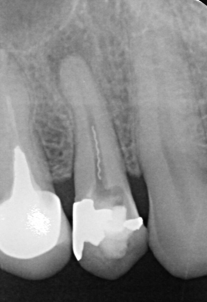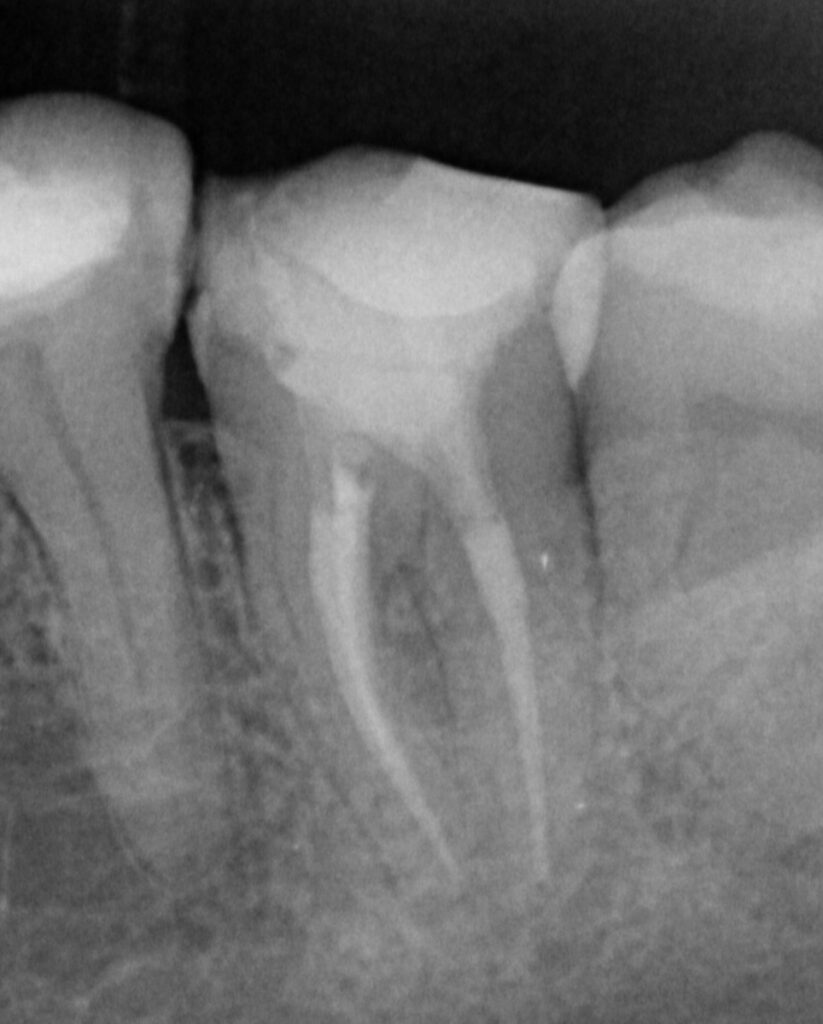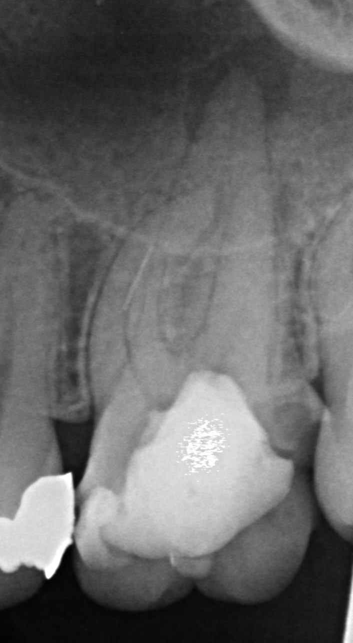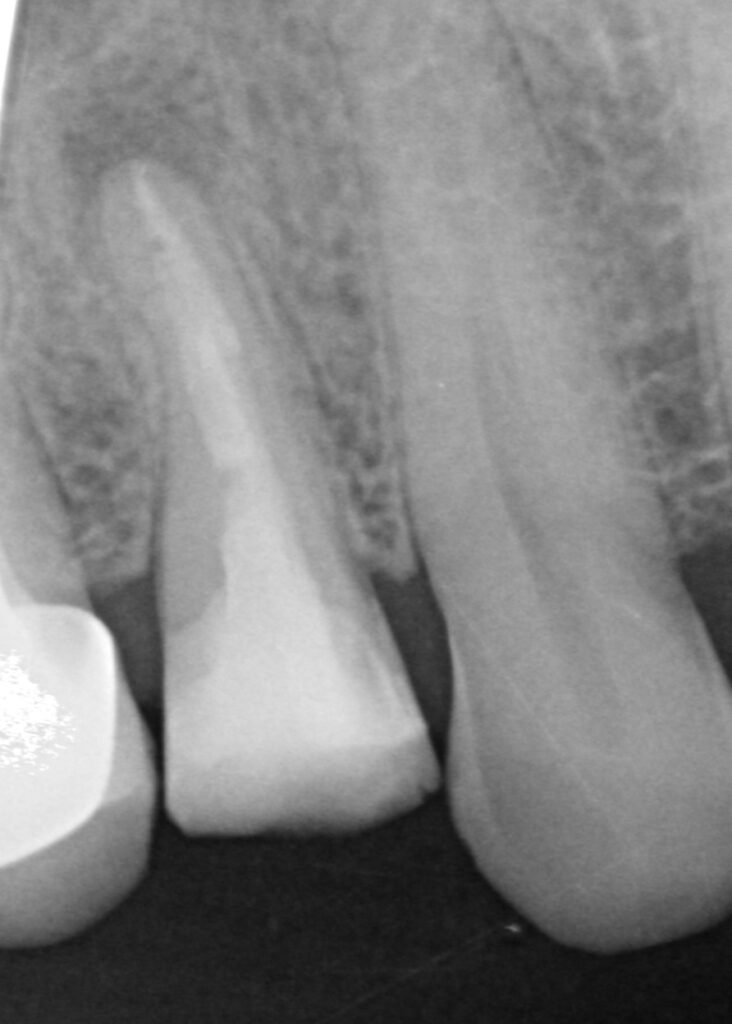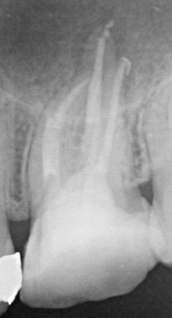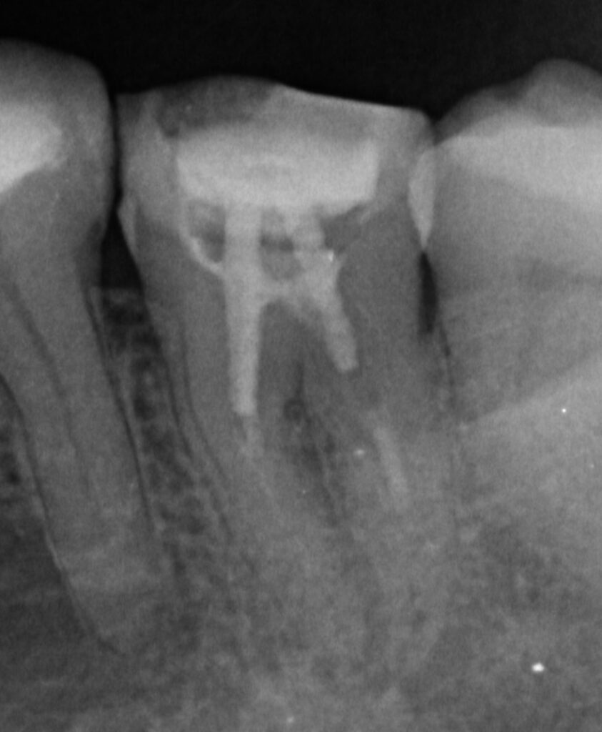 Galerie výsledků ošetření Odstranění zalomeného fragmentu kořenového nástroje z kořenového kanálku a kompletní reendodontické ošetření zubu Reendodoncie s odstraněním kovových čepů